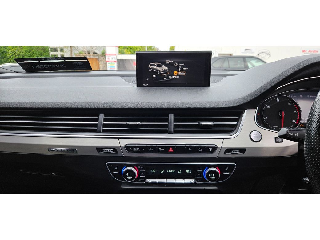 AUDI Q7 3.0 TDI S-LINE QUATTRO 7 SEAT AUTOMATIC, BLACK HALF LEATHER HALF ALCANTARA S-LINE SEATS, FULLY ELECTRIC FRONT SEATS, 2 REAR SEATS ALSO ELECTRIC, HEATED SEATS, SELECTABLE DRIVING MODES, CRUISE CONTROL, QUAD ZONE CLIMATE CONTROL, SATNAV, BLUETOOTH, MULTIPLE USB CONNECTIONS, AUX CONNECTION, MULTIFUNCTION STEERING WHEEL WITH PADDLE SHIFT, FRONT AND REAR PARKING SENSORS, STOP/START BUTTON, ELECTRONIC HANDBRAKE, AUTOMATIC LIGHTS, DAYTIME LIGHTS, ELECTRIC WINDOWS AND MIRRORS, PRIVACY GLASS, POWER FOLDING MIRRORS, HEATED MIRRORS, ROOF RAILS, MOTORISED BOOT, REMOTE CENTRAL LOCKING, ALLOY WHEELS. WELCOME TO PETERSONS - PETERSONS HAVE BEEN SELLING CARS SINCE 1970s FROM OUR LOCATION ON TIVOLI ROAD IN DUN LAOGHAIRE, WITH OUR VAST EXPERIENCE AND KNOWLEDGE ALL OUR CARS GO THROUGH A METICULOUS INSPECTION PROCESS, WE OFFER A VAST RANGE OF PRE-OWNED VEHICLES THAT ARE CHOSEN WITH OUR CUSTOMERS NEEDS IN MIND, CONTACT ANDY OR PATRICK @ SALES ON 01-2806917 TO ARRANGE A TEST DRIVE. Anti-Theft System, Central Locking, Multiple Air Bags, Parking Sensors, Remote Central Locking, Traction Control, Automatic Lights, Daytime Running Lights, Engine Immobiliser, Front Parking Sensors, Isofix Points, Rear Parking Sensors, Stability Control