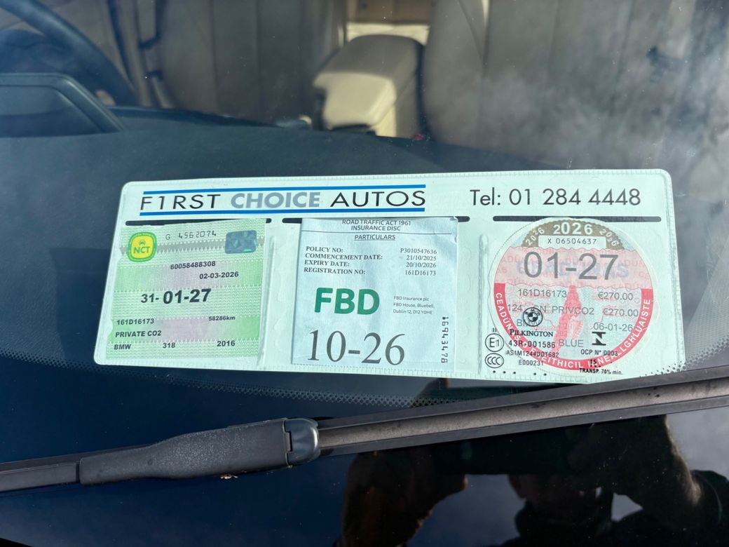 Immaculate ONE OWNER BMW 318i 1.5 Petrol ONLY 58 k Kms FULL BMW SERVICE HISTORY NEW NCT valid to 01/2027 Tax to 01/2027 Metallic blue with cream leather interior Air conditioning Cruise control Alloy wheels on excellent tyres Bluetooth inc media Two keys Warranty Call sales on 01 2844448–Brendan on 086 2524960–Nick on 087 2269787.