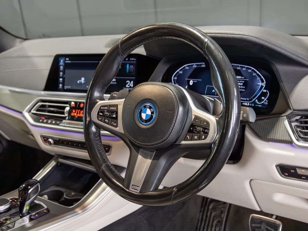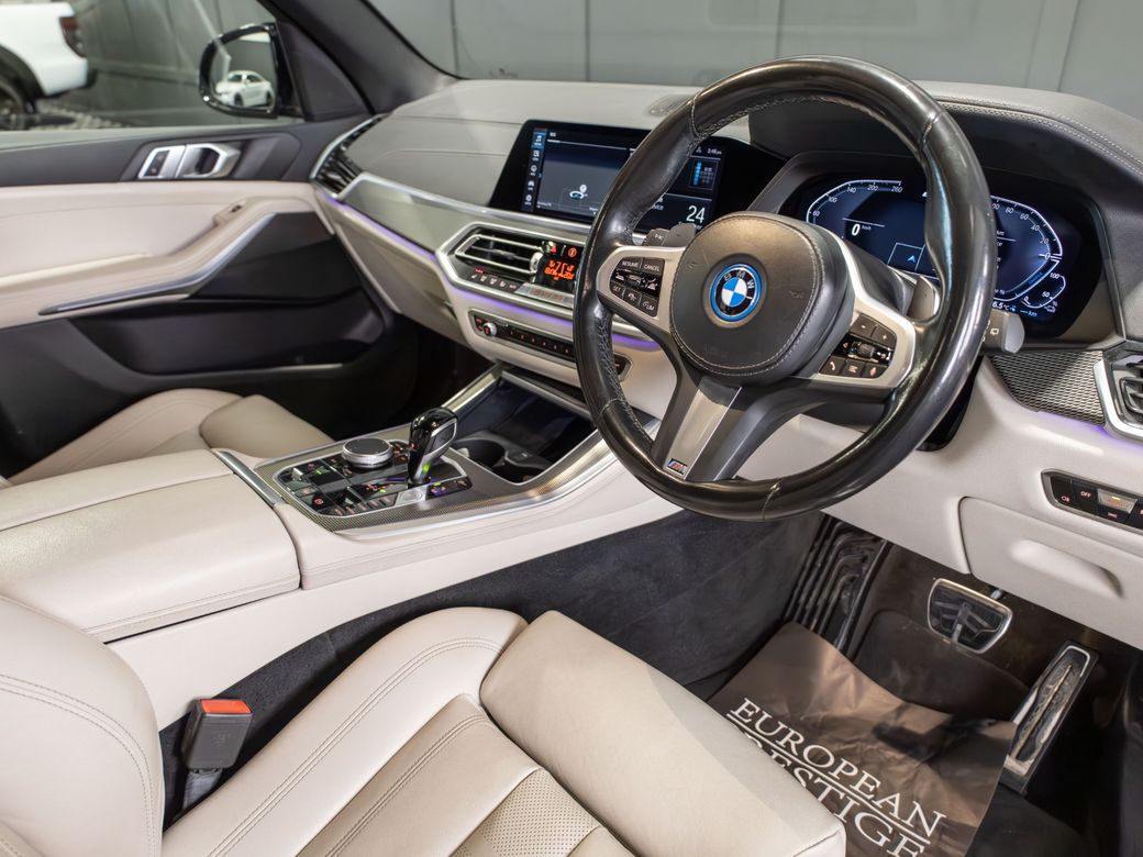 2022 (222) BMW X5 X-Drive 45e M-Sport 24kWh Battery with an Electric-Only Range of up to 82km Finished in Carbon Black Metallic with Ivory Leather Interior - 22" Gloss Black Alloy Wheels - Gloss Black Kit - Adaptive Air Suspension - Heated, Electric, Folding Mirrors - Heated, Electric Front Seats with Lumbar Support - Memory Driver Seat - Leather Multifunctional Steering Wheel with Paddle Shift - Electrically Adjustable Steering Column - Cruise Control - Virtual Cockpit - Wide Touchscreen Infotainment System - Touchpad - Satellite Navigation - Bluetooth & USB Connectivity - Apple CarPlay & Android Auto - Wireless Phone Charging - Reverse Camera - Front & Rear Parking Sensors - Air Conditioning - Dual Zone Climate Control - Selectable Drive Mode - Hill Descent Control - Electronic Handbrake - Auto Hold - Privacy Glass - Colour Changing Ambient Interior Lighting - Auto Lights - LED Headlights - LED Daytime Running Lights - LED Tail Lights - High Beam Assistant - Auto Wipers - Motorised Tailgate - Luggage Compartment Cover - Folding Rear Seats - Isofix - Statutory Emergency Call System Warranty inclusive (options for extended warranty available) Finance available Trade ins are considered Indoor viewing in Naas, Co. Kildare Call Aaron on 087-0356815 or Bob on 087-3855810 for more information or to arrange a test drive.