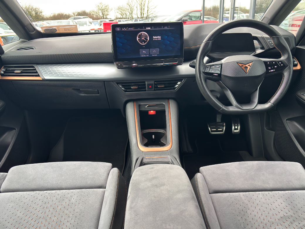 2023 Cupra Born e-Boost in Manganese Grey Metallic with Dinamica Sports Interior. A one owner Irish car from new with full Cupra dealer service history. Coming with a 94.1% EV Battery Health Score (see certificate in vehicle images, scan QR code in image for extra information). Features include Racing shell seats, heated, in fabric Dinamica -- Adaptive cruise control (with follow-to-stop) and traffic jam assist -- 19-inch Typhoon alloy wheels -- Lane keeping system plus semi-automatic vehicle control -- LED headlamps with High-beam assistant -- Intelligent park assist -- Front, rear and side view camera system -- Rear traffic alert and lane change system and exit warning system -- Comfort telephone with wireless charging -- Mirror Link plus Wireless App -- Leather-wrapped multi-function steering wheel, heated -- Keyless locking and starting system -- Child seat anchors system i-Size, 2x top tether and child seat anchors in front on front passenger side -- Alarm System. This car will be fully serviced prior to sale and comes complete with a 12 months unlimited mileage warranty in addition to its manufacturers EV battery warranty to 16.02.2031 or 160,000km, whichever comes sooner. The car also comes with 12 Months AA Premium Assistance. We accept certain makes and models in Part Exchange subject to having full service history, a current NCT test (minimum six months to expiry) and verifiable mileage. To discuss this car further please call into our showroom, phone us on 091 383000 or send us an online enquiry -- You can also reserve this car for 48 hours on our website -- Due to fast stock turnaround we recommend phoning in advance of travelling to check if the car of your choice is available -- We are an independently owned and operated dealership and our highly experienced team have over 100 years of combined motor industry experience.
