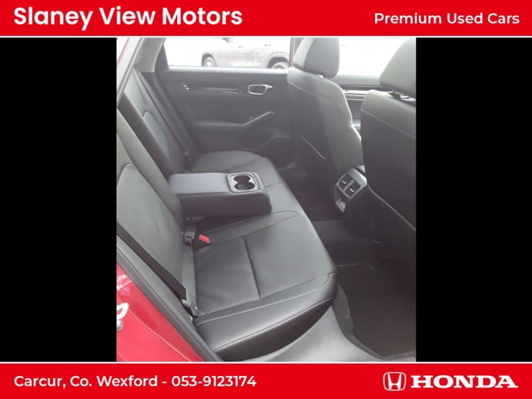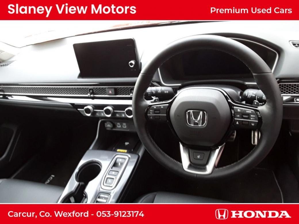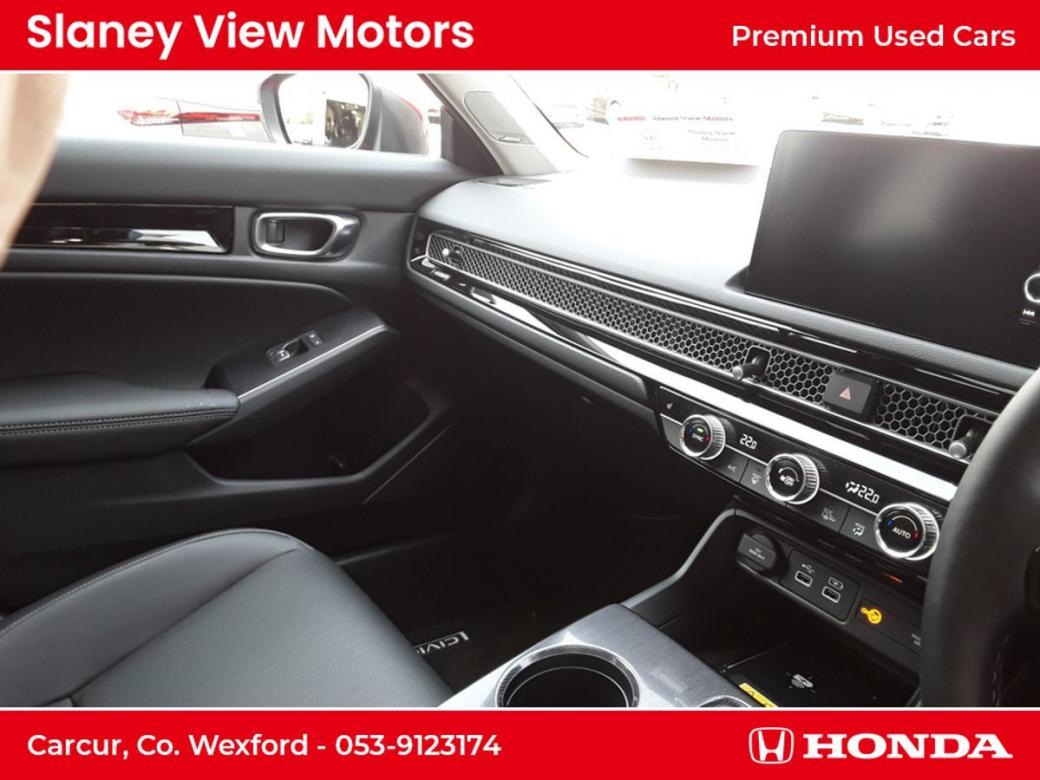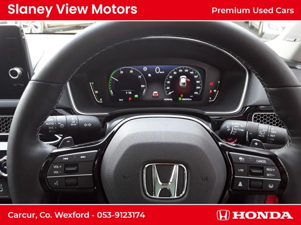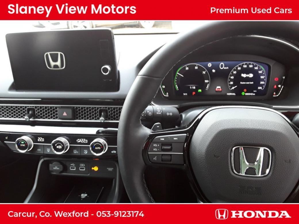 The all-new Civic eHEV embodies self-charging hybrid technology at its most advanced with responsiveness and efficiency built-in. Every drive delivers exhilaration with pleasure and because eHEV gives you a full hybrid experience, the Civic can run exclusively on smooth, silent electric power - unlike a mild hybrid. Honda eHEV technology means you can enjoy the benefits of electrified motoring, such as instant power, all of the time. As a self-charging hybrid that makes its own electricity, youll never need to connect to the mains its maximum energy with minimum fuss. The all-new Civic really is the drivers hybrid. Switching effortlessly between Normal, Sport, Econ and Individual allows you to tailor your drive to suit your preference and get the best performance from the eHEV system. Immerse yourself in a generous and stylish interior the all-new Civics longer wheelbase creates more space and greater comfort for you to enjoy. An ergonomic driving position, plus Hondas new Body Stabilising front seats reduce the stress of a long journey and are a further innovation designed to help you drive relaxed and arrive refreshed. Intelligently designed fabrics and quality you can feel make the cabin a refined place to be at any pace. An enhanced suite of Honda SENSING features and a total of 11 airbags are proof-positive that safety is built into the very fabric of the all-new Civic. The new 100 front wide-view camera has enhanced road marking and vehicle recognition abilities, while the rear camera and the all-round sonar sensors make the Civic one of the safest places on the road. Specs Include- 10.2 Multi Info Display Adaptive Driving Beam Air Conditioning Dual Zone Auto with Rear Vent Blind Spot Information Four Driving Modes Front Fog Lights Heated Steering Wheel Honda CONNECT with Navigation, 9 touchscreen, AM / FM / DAB, Apple CarPlayand Android Auto Honda SENSING Leather Seats LED Lights Opening Panoramic Glass Roof Power Front Seats Premium Audio with 12 Bose Speakers Privacy Glass Rear View Camera with Front and Rear Parking Sensors Wireless Charging.