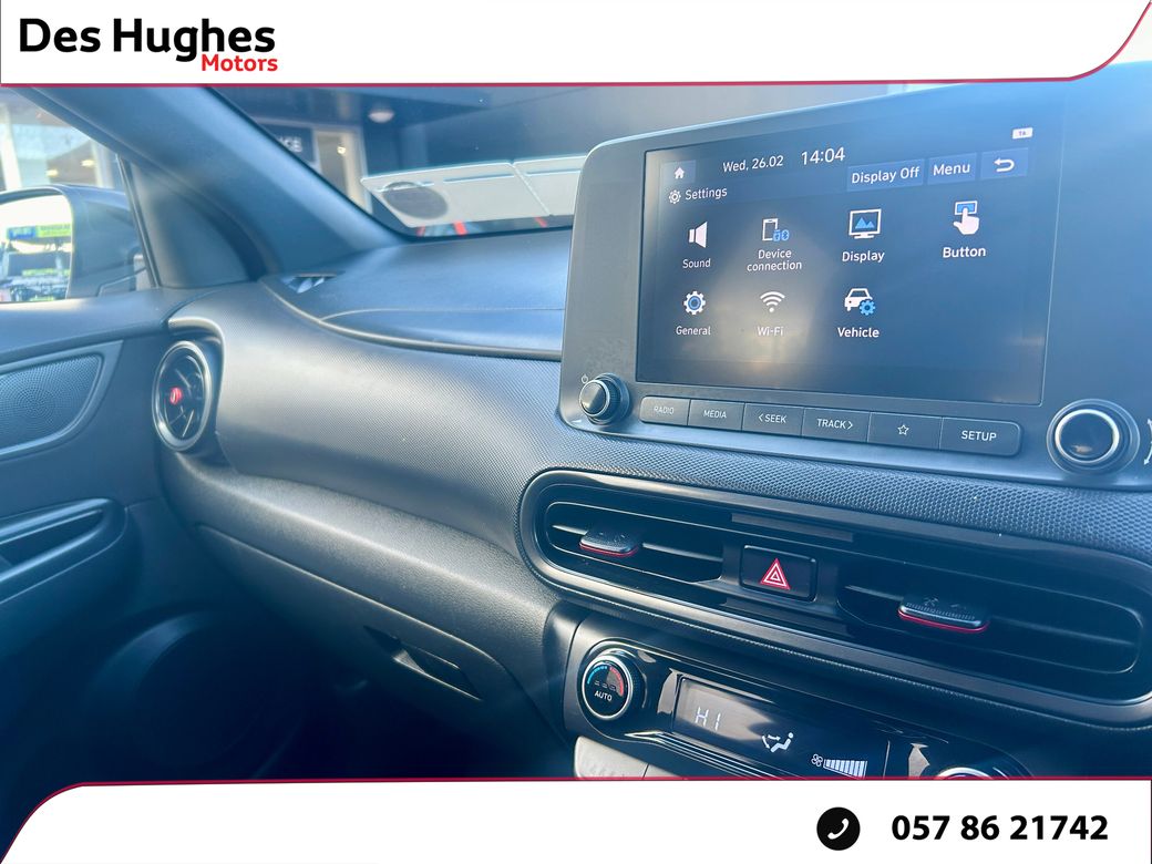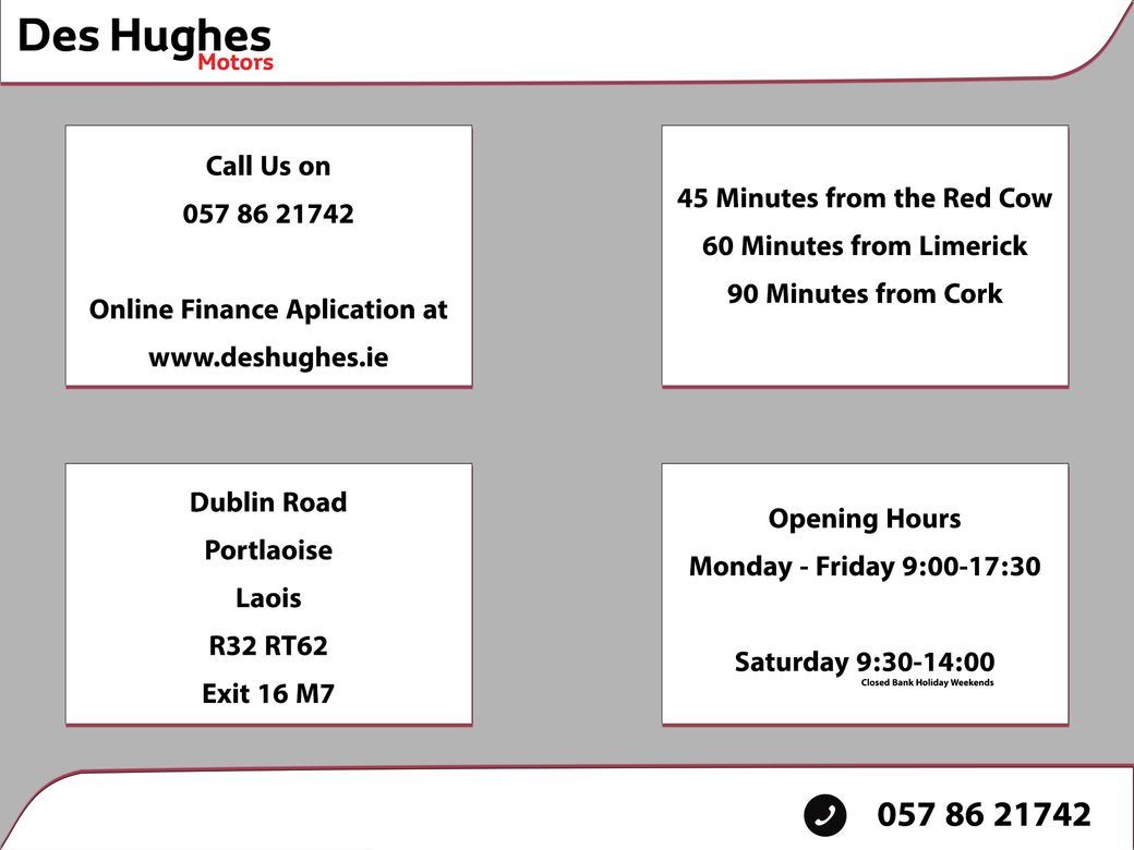 Contact COLIN for anymore info on 087 0541111. Hyundai Kona Top Spec N-Line model. 1 owner from new. Hyundai manufacturer warranty. Trade ins welcome. New Nct Finance available. Contact COLIN for anymore info on 087 0541111. Located in Portlaoise Des Hughes Motors, Established in 1987 we have a lifetime of experience in the Motor Trade. We are the Fiat, Jeep & Fiat Professional dealers for Laois and surrounding areas. Having previously represented Toyota in Laois for nearly 30 years, and remain the only Toyota Authorised repairer in Laois. We strive to always ensure that you leave happy, whether its is your 1st or 10th car to purchase from Des Hughes Motors. We operate a transparent pricing structure, we price check all our vehicles on a weekly basis, comparing condition, mileage, specification, and warranty terms to ensure we can always offer outstanding value to our customers. All of our vehicles undergo a comprehensive presale process which includes a History Check, Tyre Check (4mm Minimum), Vehicle Service & Vehicle Valet. We are Open Monday to Friday 9:00-5:30, Saturday 9:30-2:00. We are closed during Bank Holiday Weekend. Contact us on 057 86 21742 | sales@deshughes.ie or apply for finance 24/7 on www.deshughes.ie.