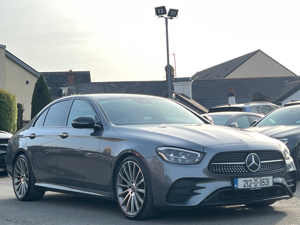 **ONLY TEN MINUTES FROM BLANCHARDSTOWN SHOPPING CENTRE** 2021 Mercedes E220D AMG Night Edition Auto in immaculate condition throughout. Original Irish car with a full service record and huge spec to include: upgraded alloy wheels, xenon headlights, front foglights, keyless entry & start, electric windows & mirrors, folding mirrors, reverse camera, widescreen sat nav, electric front seats, sport seats, ambient lighting, bluetooth telephone system, wood dash inlays, ambient lighting, cruise control, media control unit, front centre armrest, climate control with A/C, leather multifunction sport steering wheel, abs, isofix, esp, multiple airbags etc. For further information, please contact Aaron on 01 8017777 / 083 1155301.