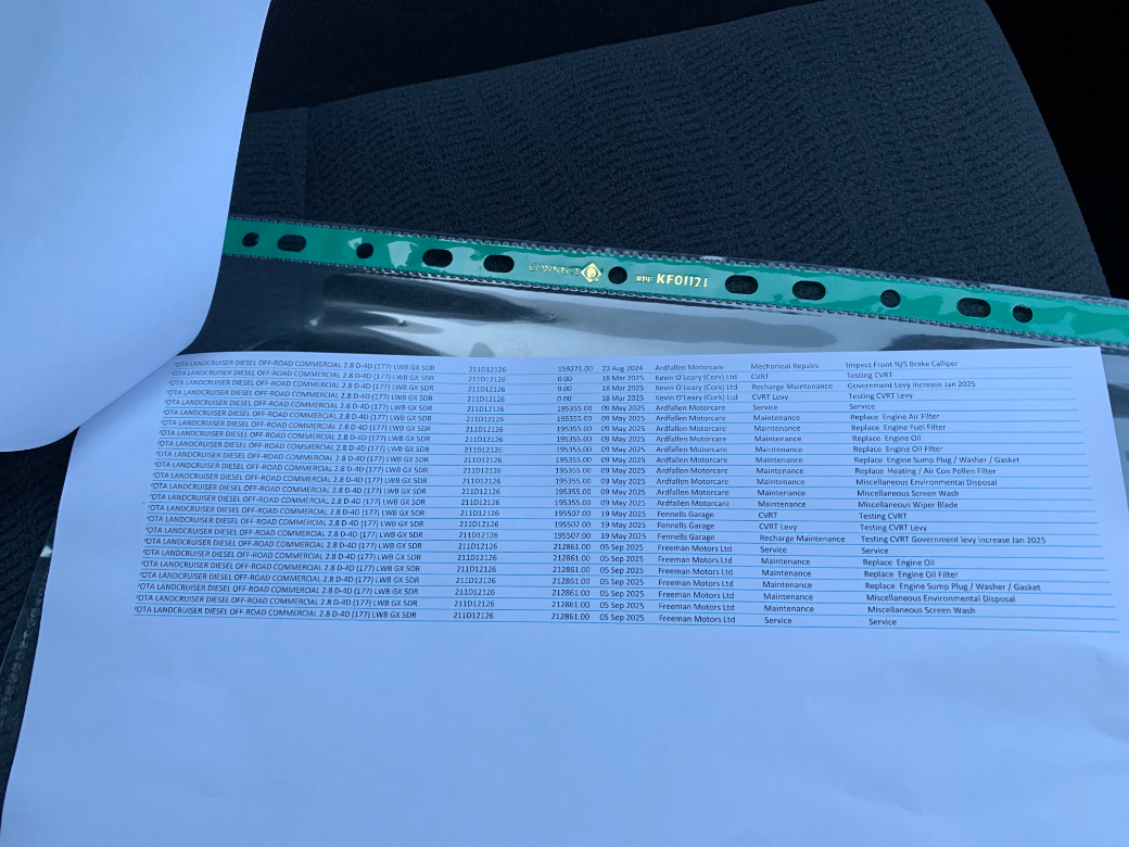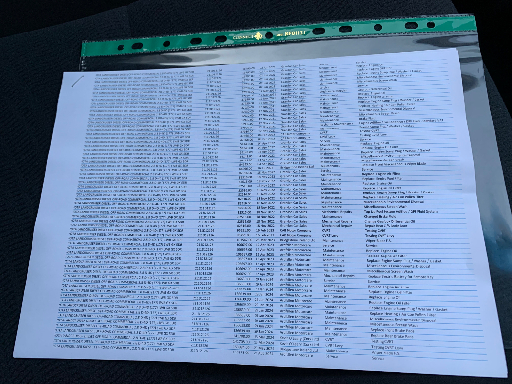 Just Arrived. This 2021 Toyota Landcruiser 2.8 LWB 2 Seater Commercial in Great Condition. One previous owner. Excellent Documented Service History and no expense was ever spared. There's an Excel Spreadsheet available detailing every single spend to date. 02/26 CVRT and €333 Road Tax per Annum. In fantastic condition throughout. A dream to drive with Toyota reliability. The price Excludes VAT (€35950 Including VAT). Unrivalled towing capacity of (3500 KG'S - braked trailer). A very capable vehicle on or off the road with its switchable 4WD system. It comes with a host of extras. Alloy Wheels, Cruise Control, Reverse Camera, Air Con, Bluetooth, Power Folding Mirrors, Multi Functional Steering Wheel, Electric Windows, Electric Mirrors and Remote Central Locking are all standard just to list a few.....................................Its supplied fully serviced, professionally valeted and with a warranty. At Beechlawn Motors Ltd we have over 18 years experience in supplying quality used vehicles. With over 100 Cars and Commercial in stock we have a vehicle to suit everyones needs. (Finance Available on a certain models). Beechlawn Motors Ltd, Unit GA1, Sitecast Industrial Estate, Greenhills Road, Dublin 24, D24 YE2K. Opening hours Monday - Friday 8.00 - 17.00. Saturday 10.00 - 14.00. Closed Sunday. After hours by appointment only. 01-4508514 or 086-8393233.